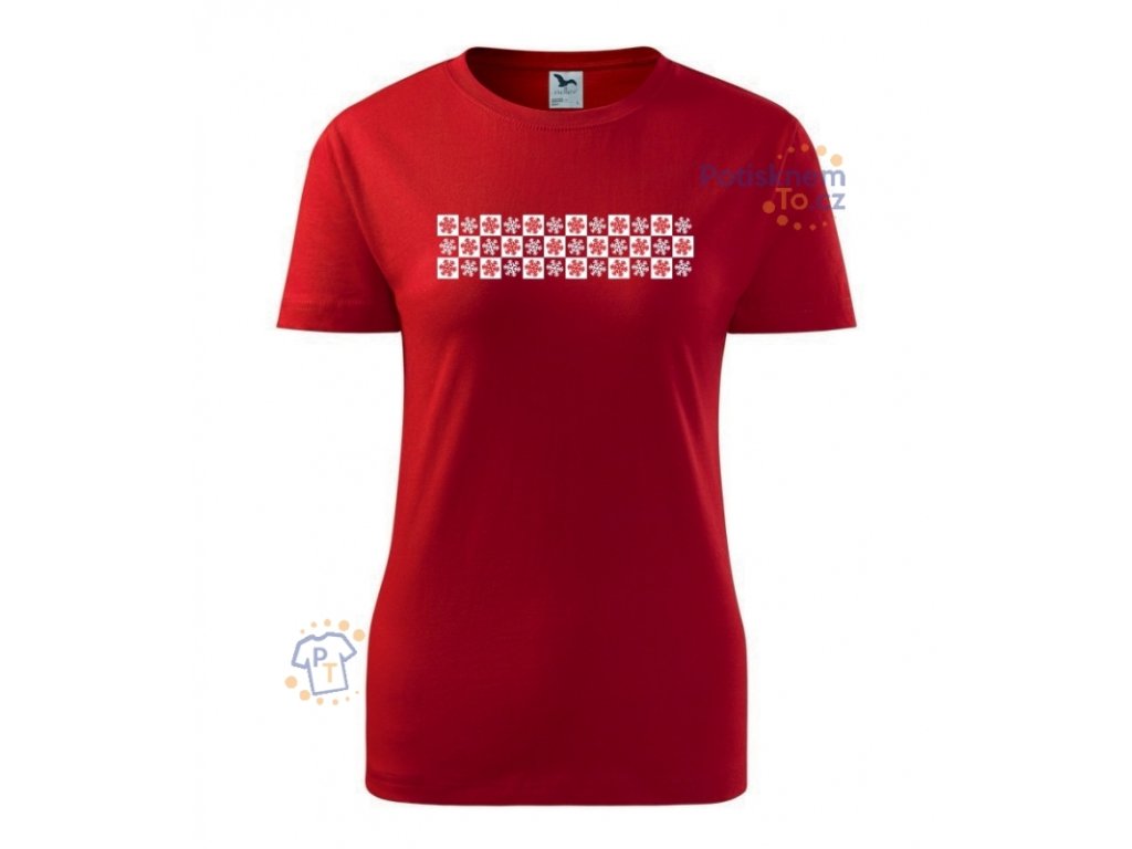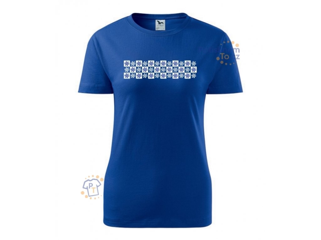 Triko dámského střihu s decentním zimním motivem sněhových vloček. Ukažte se při vánočním setkání s přáteli/kolegy, u vánoční tabule a stromečku nebo zimním pobytu na horách ve stylovém tričku, nebo jím obdarujte své blízké. Na výběr je také triko pánského střihu.