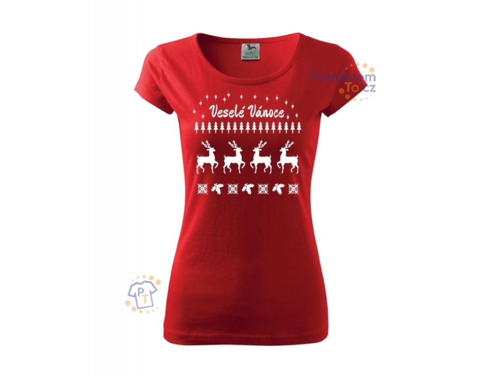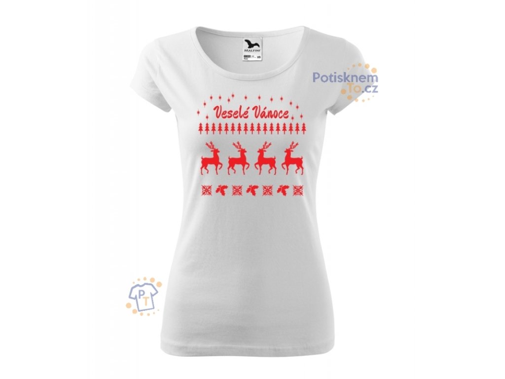 Tričko v dámském střihu s krátkým rukávem. Speciální vánoční potisk Veselé Vánoce se siluetami sobů. Ukažte se u vánočního stolu a stromečku v originálním triku, nebo jím obdarujte své blízké. Na výběr je také v pánském střihu.