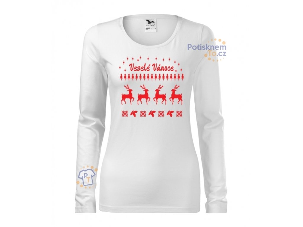 Triko v dámském střihu s dlouhým rukávem. Speciální vánoční potisk Veselé Vánoce se siluetami sobů. Ukažte se u vánočního stolu a stromečku v originálním triku, nebo jím obdarujte své blízké. Na výběr je také v pánském střihu.