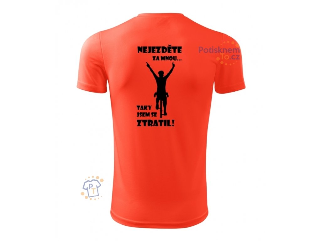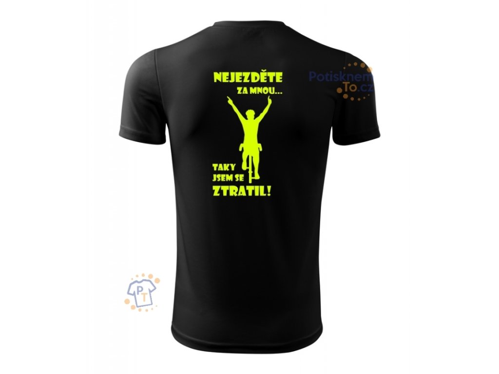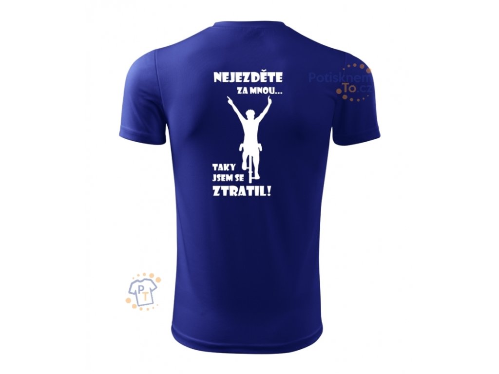 Pánský střih rychle schnoucího, sportovního trika. Originální potisk zadní části trika Nejezděte za mnou... také jsem se ztratil cyklisty za vámi jistě pobaví. Vtipný dar pro manžela, přítele, známého cyklistu.