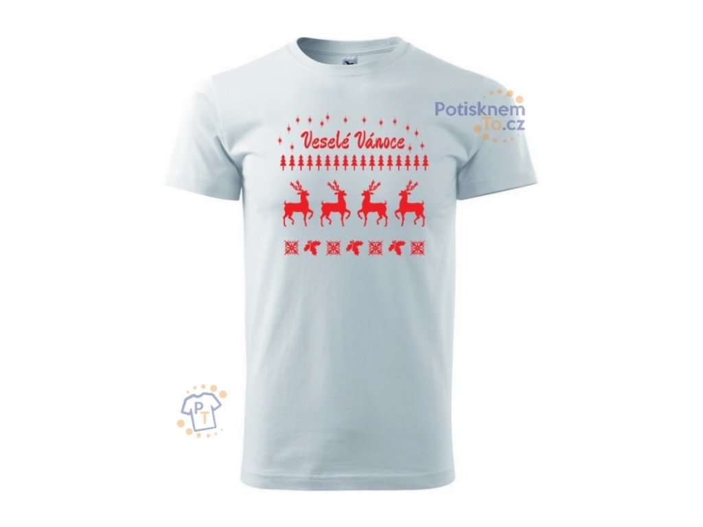 Triko v pánském střihu s krátkým rukávem. Speciální vánoční potisk Veselé Vánoce se siluetami sobů. Ukažte se u vánočního stolu a stromečku v originálním triku, nebo jím obdarujte své blízké. Na výběr je také v dámském střihu.