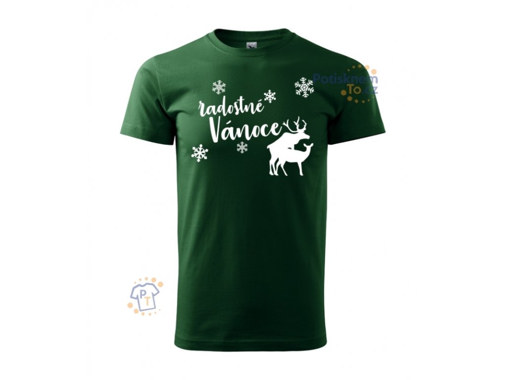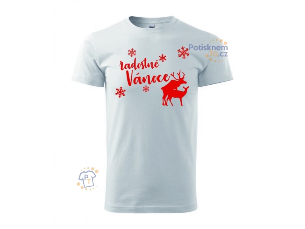 Triko pánského střihu. Speciální vánoční potisk Radostné Vánoce s kopulujícími jeleny. Originální a vtipný potisk pobaví jak u svátečního stolu, tak i obdarovaného pod stromečkem. V nabídce také triko dámského střihu.